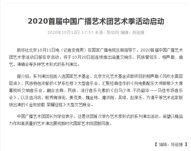中國廣播藝術團藝術季,是由中國廣播藝術團打造的優質演出精品項目,是在廣電總局領導下以習近平新時代中國特色社會主義思想為指引,積極推進文化創造性轉化、創新性發展的重要實踐,藝術季以優秀的精品力作和高質量的藝術呈現展示新時代國家藝術院團的嶄新風采。